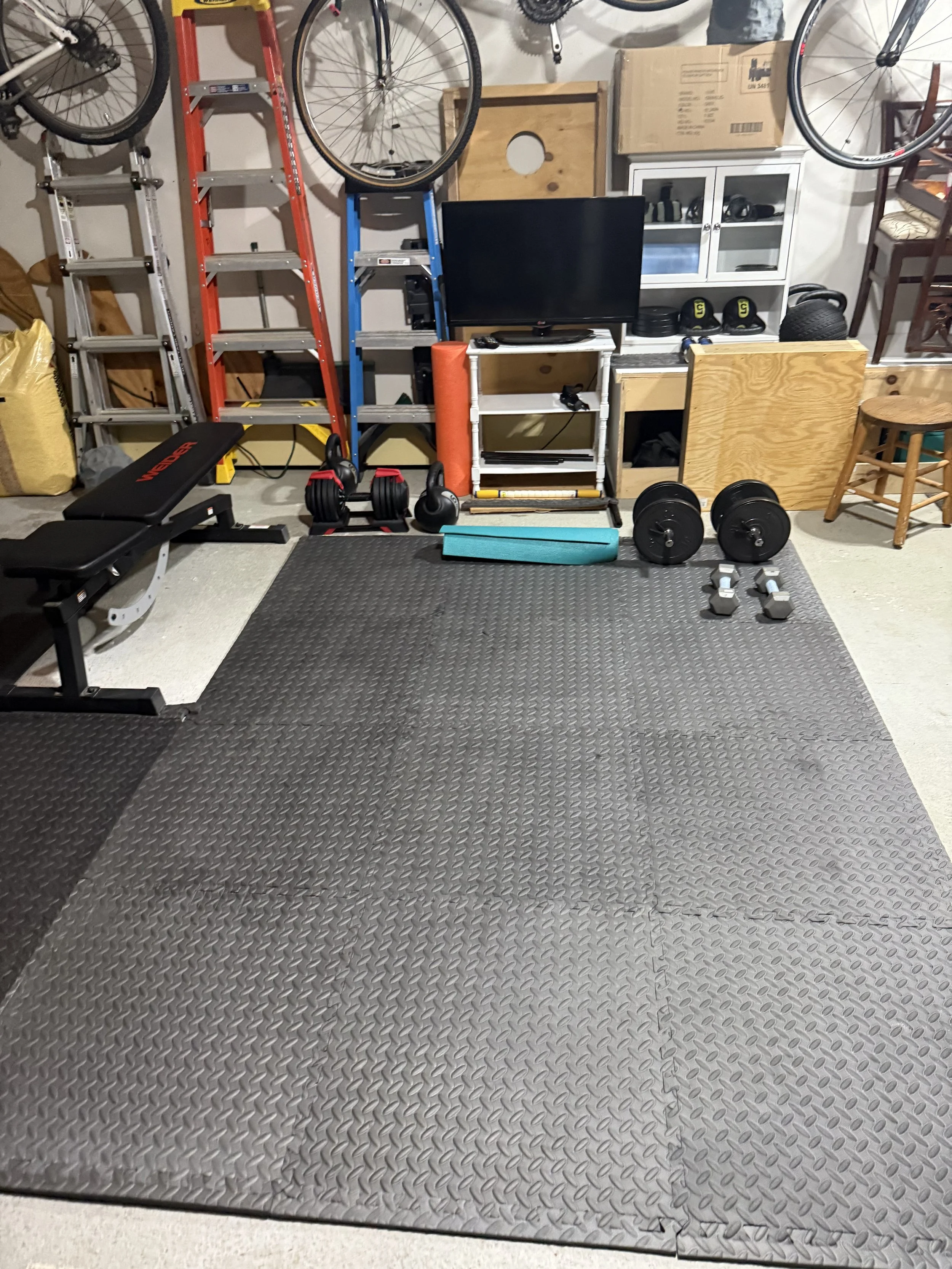 After months of working out in my living room, something clicked: I needed my own dedicated space. The living room was functional, yes, but it was crowded, full of distractions, and limited in what I could do. I wanted freedom — freedom to move, lift, stretch, and build a full routine without worrying about bumping into furniture or downward dogging over the actual dog. That’s how my garage gym was born.